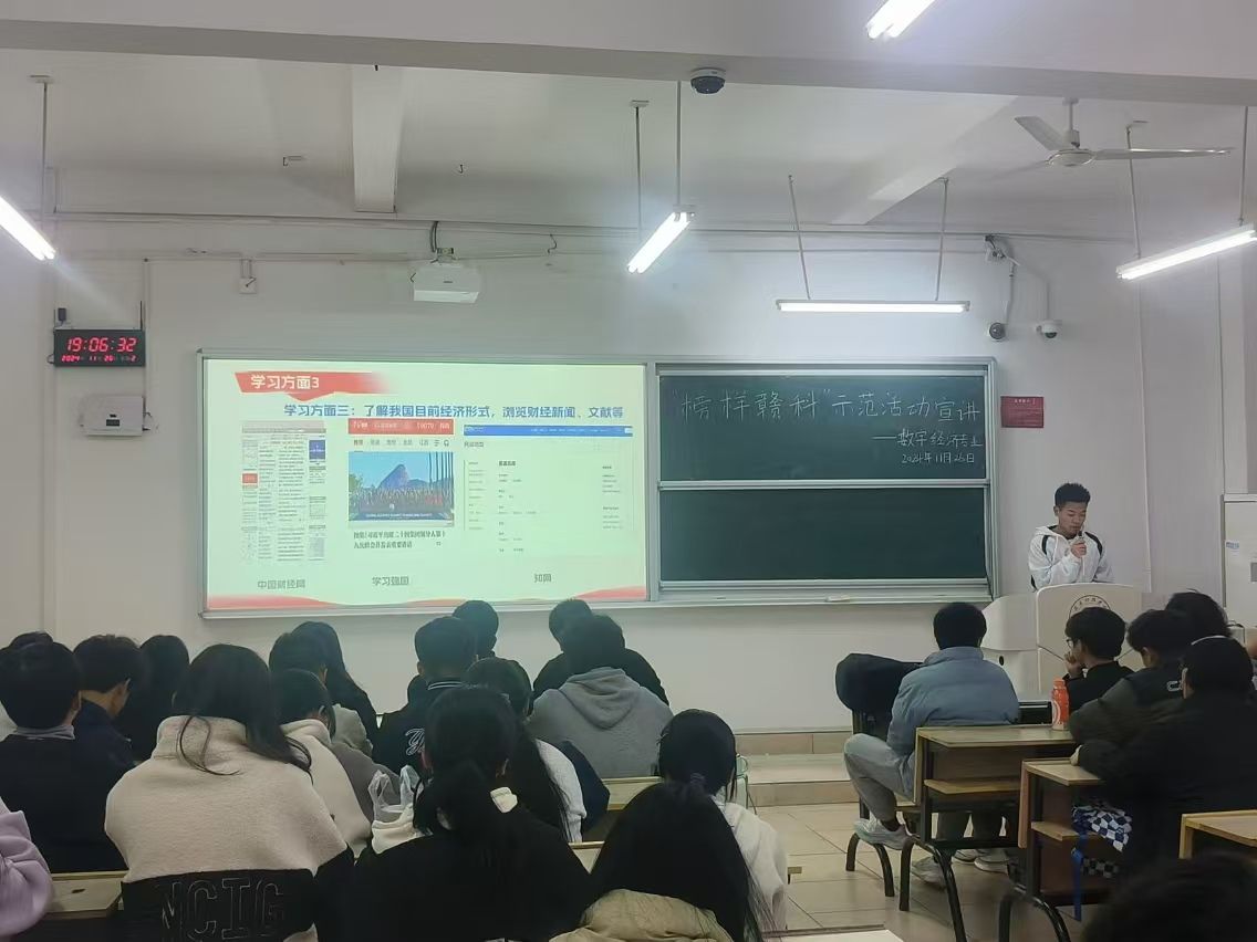 本网讯:为进一步激发同学们的学习热情,从优秀员工榜样中汲取力量,11月25日,365英国上市集团举办“榜样赣科”主题宣讲活动。本次活动邀请获得2024年国家奖学金的涂传同学为大家分享自己的学习经历与感悟,2024级数字经济专业全体员工参加。