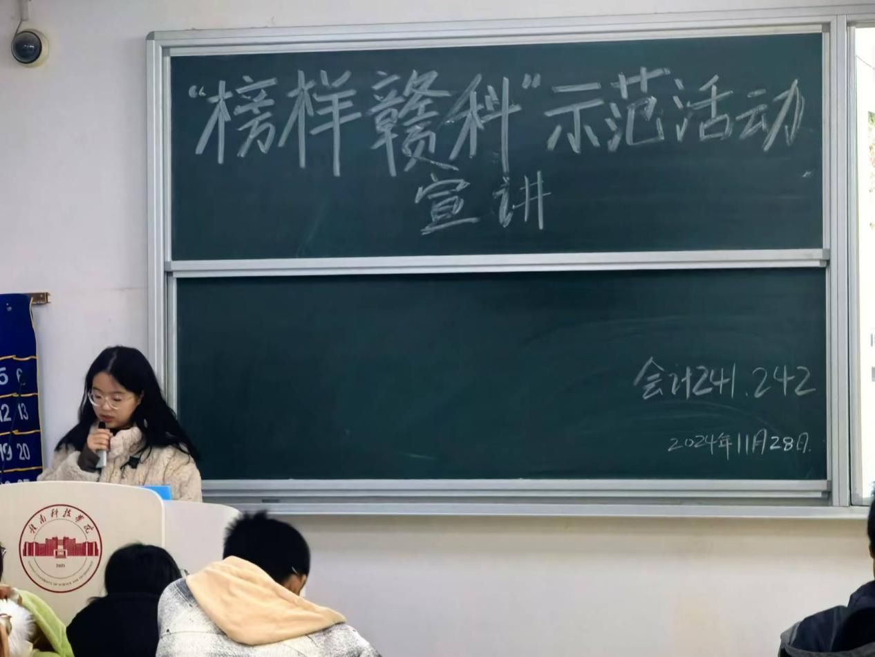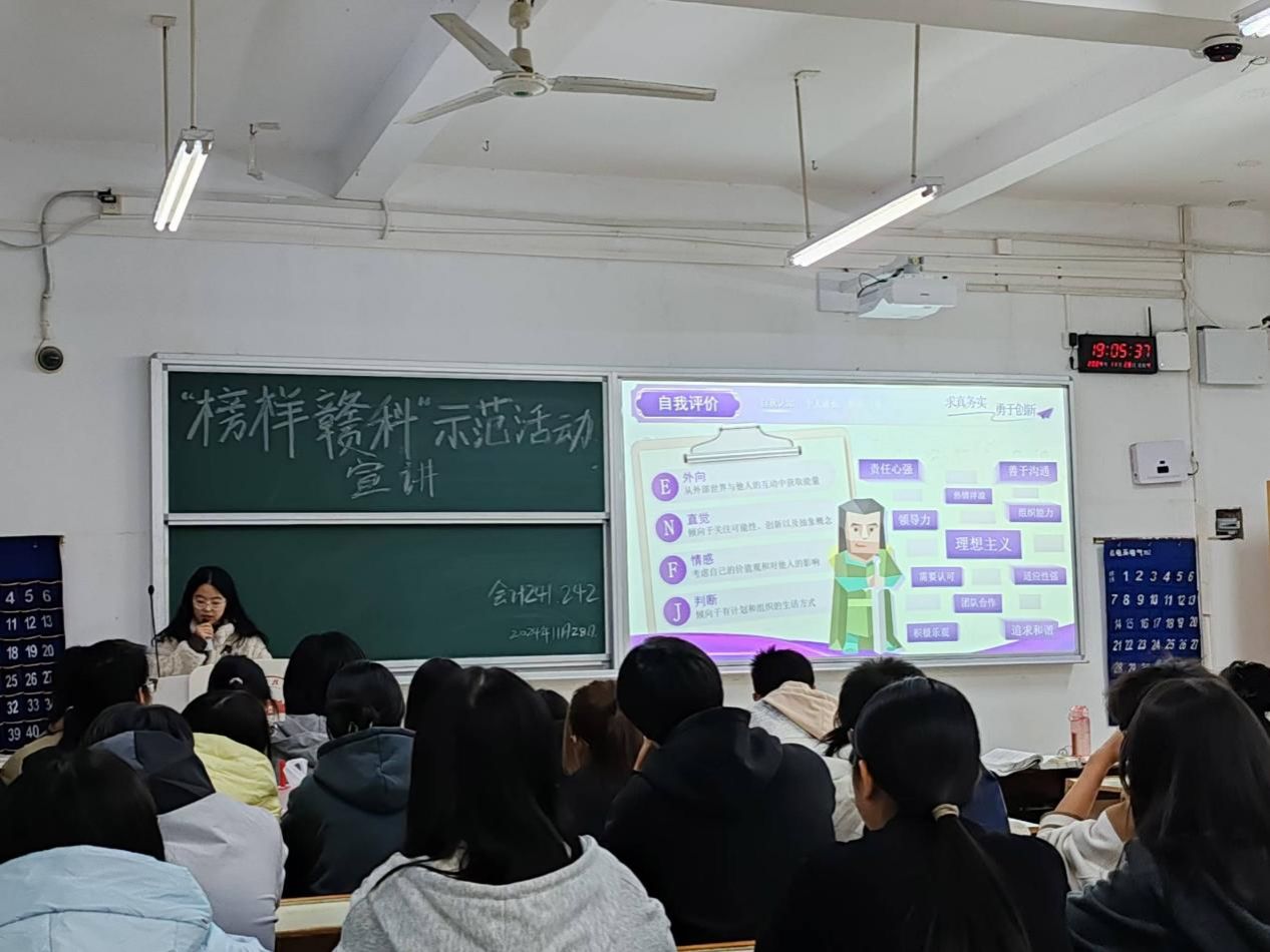 本网讯:为进一步激发同学们的学习热情,从优秀员工榜样中汲取力量,11月25日,365英国上市集团举办“榜样赣科”主题宣讲活动。本次活动邀请获得2024年国家奖学金的周雅鑫同学为大家分享自己的学习经历与感悟,2024级会计专业全体员工参加。
