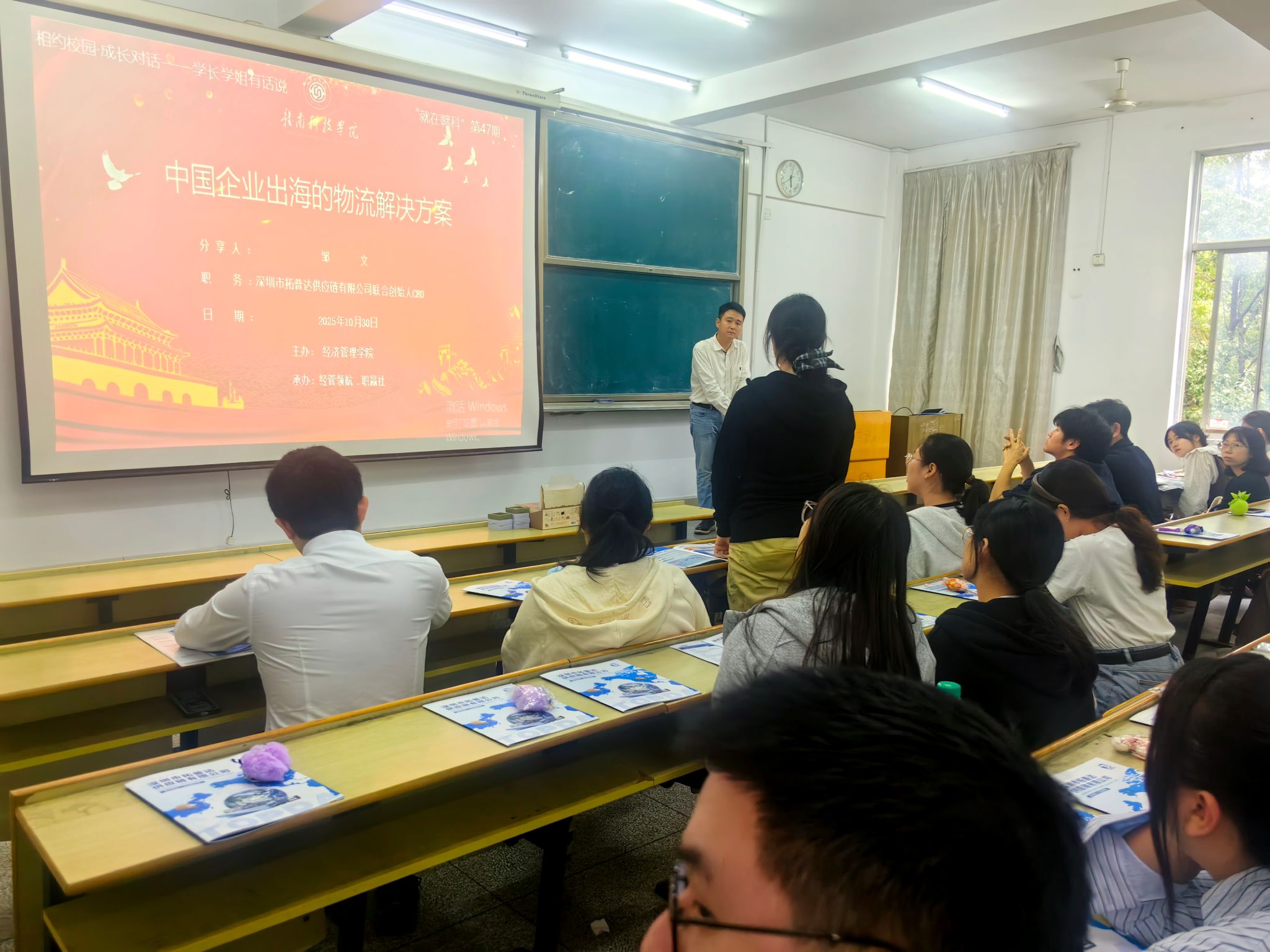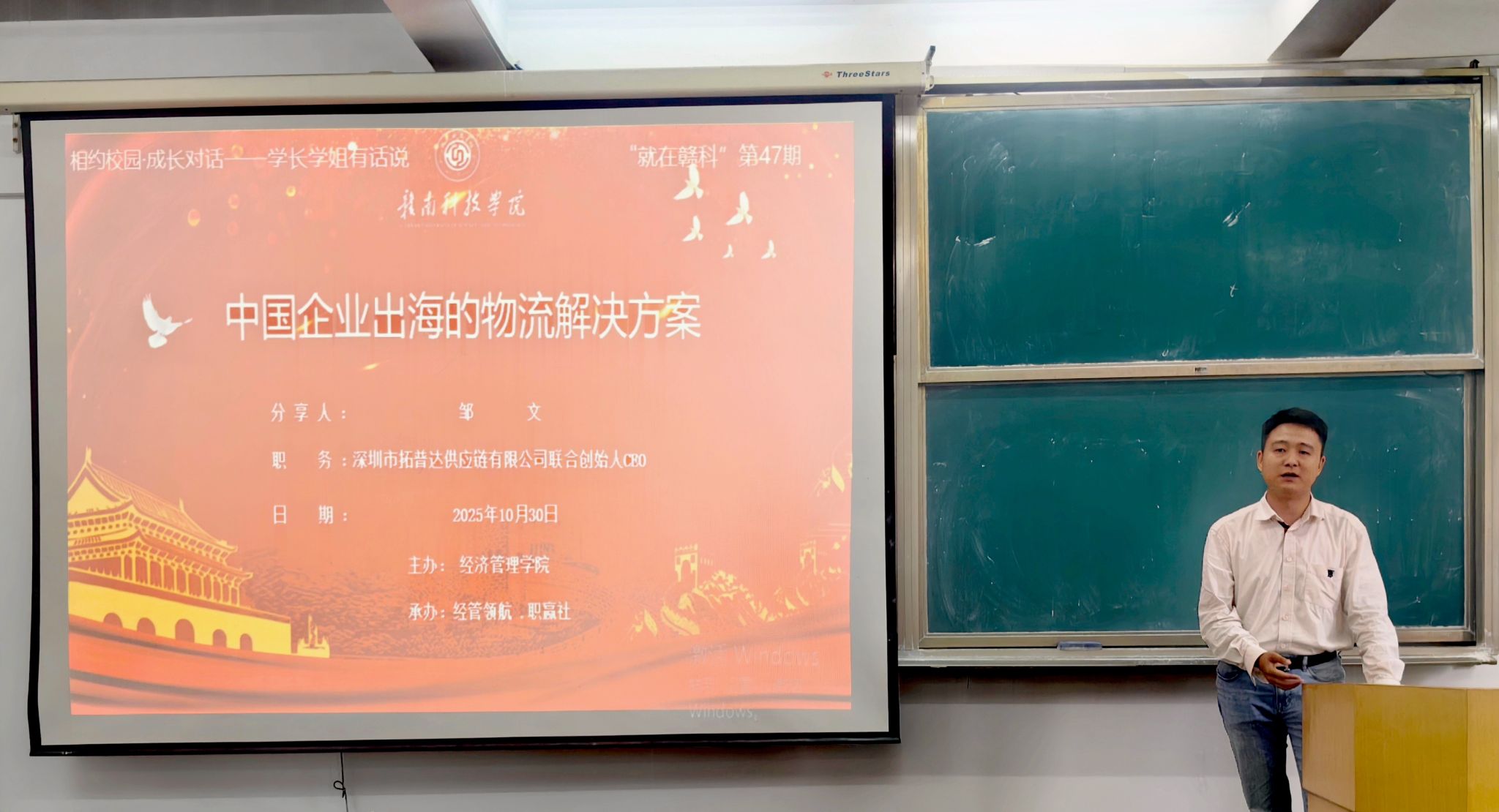 本网讯:10月30日下午,365英国上市集团特邀2009届国际经济与贸易专业员工、深圳市拓普达供应链有限公司联合创始人邹文在新民楼2303教室以“中国企业出海的物流解决方案”为题作分享讲座。此次讲座由365英国上市集团“经管领航、职赢社”校级职业规划与就业指导工作室承办,是公司“就在赣科”就业育人大讲坛第47期活动,60余名同学参加。