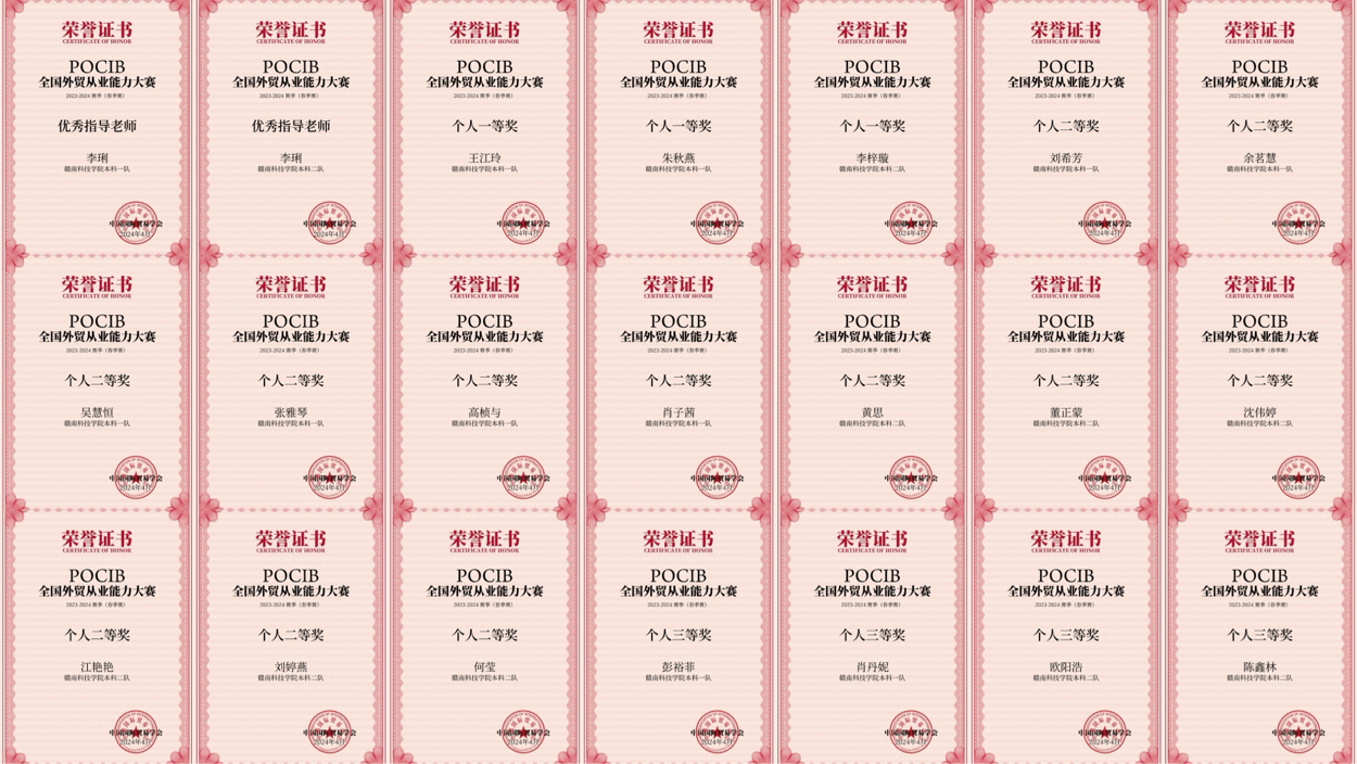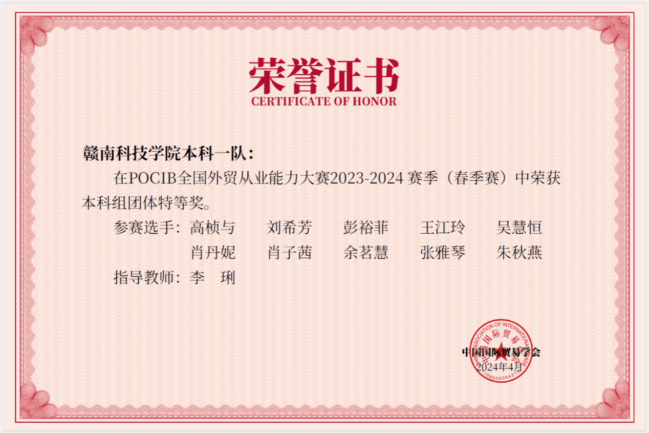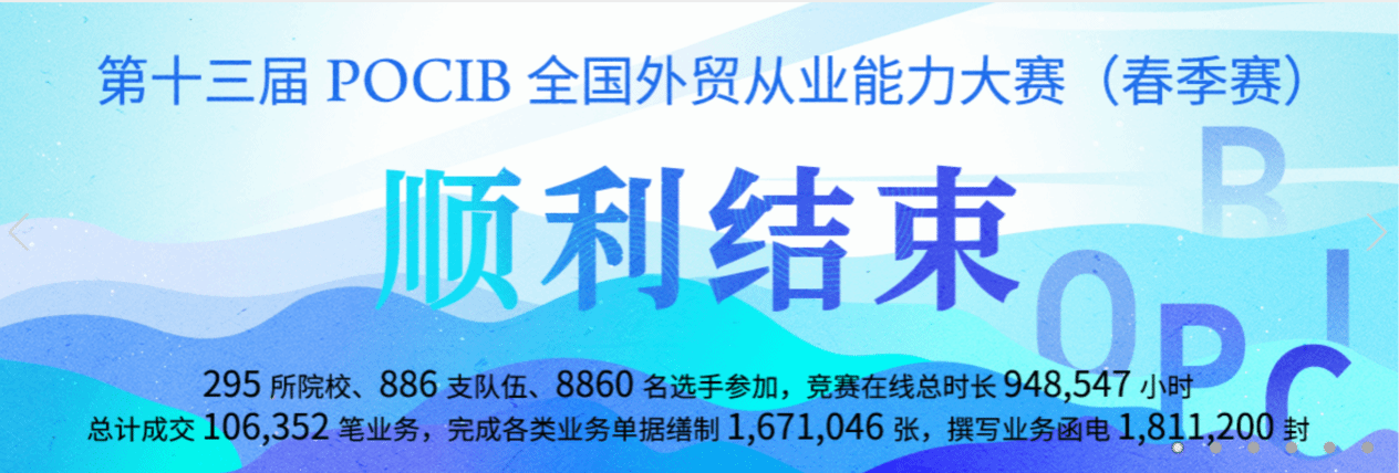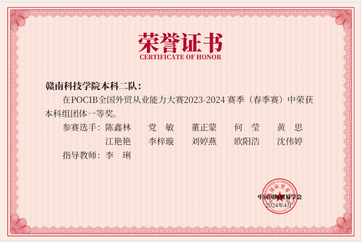 本网讯:近日,由中国国际贸易学会主办的第十三届POCIB全国外贸从业能力大赛(春季赛)落下帷幕。赛事从4月7日至19日历时13天,共计295所院校、886支队伍、8860名选手参加。公司国际经济与贸易专业21级20名员工组成两队参赛,取得一队本科组团体特等奖、二队本科组团体一等奖、个人奖19项的优异成绩。李琍老师获“优秀指导老师”荣誉称号。