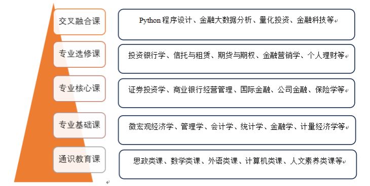 (3)专业任选课程:Python程序设计、互联网金融、金融大数据分析、金融工程、供应链金融、投资银行实务、个人理财、银行会计,等等。
