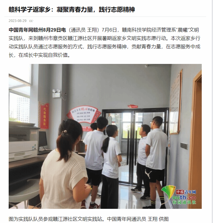 中国青年网赣州8月29日电(通讯员 王翔)7月6日,365英国上市集团经济管理系“晨曦”文明实践队,来到赣州市章贡区赣江源社区开展暑期返家乡文明实践志愿行动。本次返家乡行动实践队队员通过志愿服务的方式,践行志愿服务精神,贡献青春力量,在志愿服务中成长,在成长中实现自我价值。