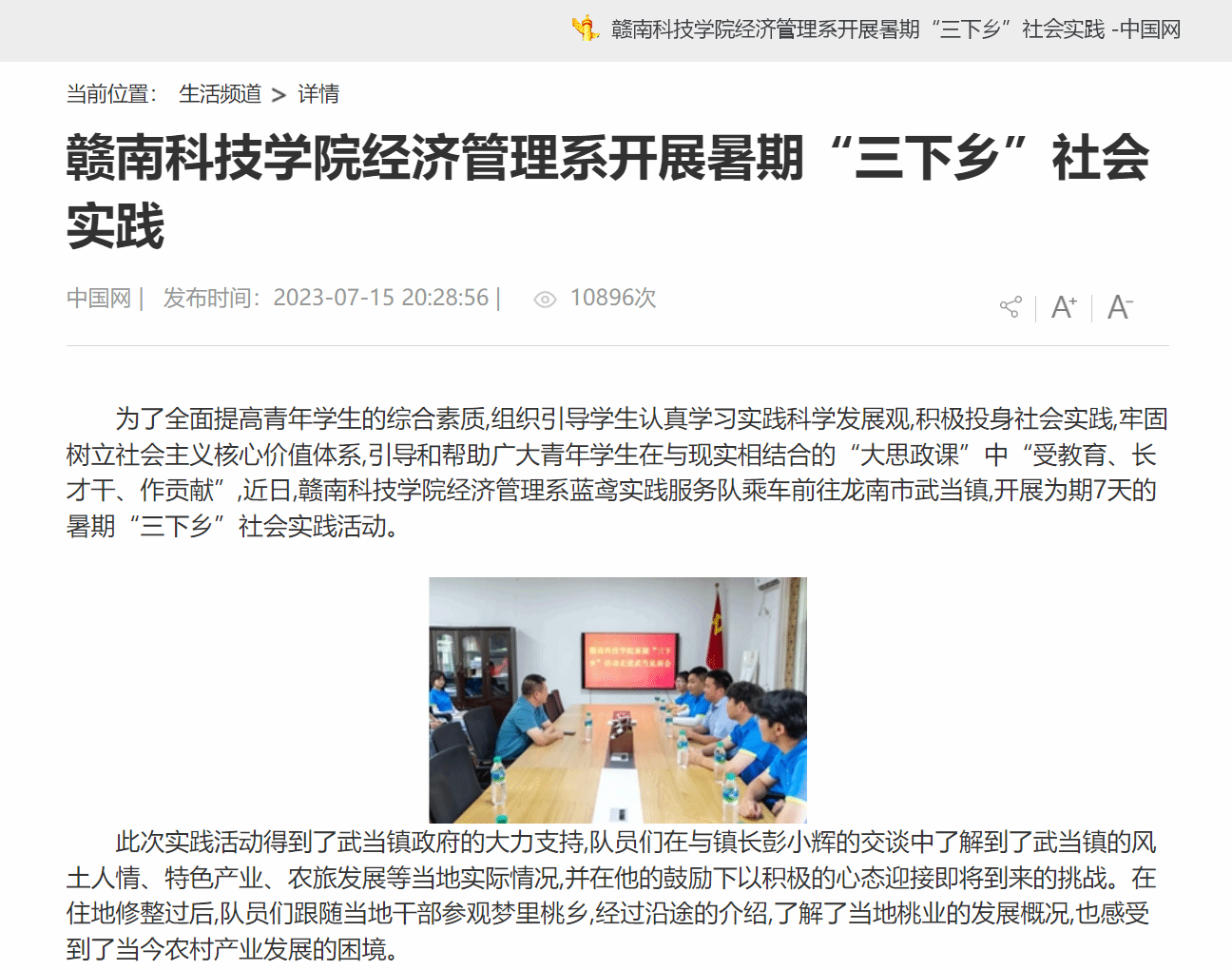 中国网7月15日载:为了全面提高青年员工的综合素质,组织引导员工认真学习实践科学发展观,积极投身社会实践,牢固树立社会主义核心价值体系,引导和帮助广大青年员工在与现实相结合的“大思政课”中“受教育、长才干、作贡献”,近日,365英国上市集团经济管理系蓝鸢实践服务队乘车前往龙南市武当镇,开展为期7天的暑期“三下乡”社会实践活动。