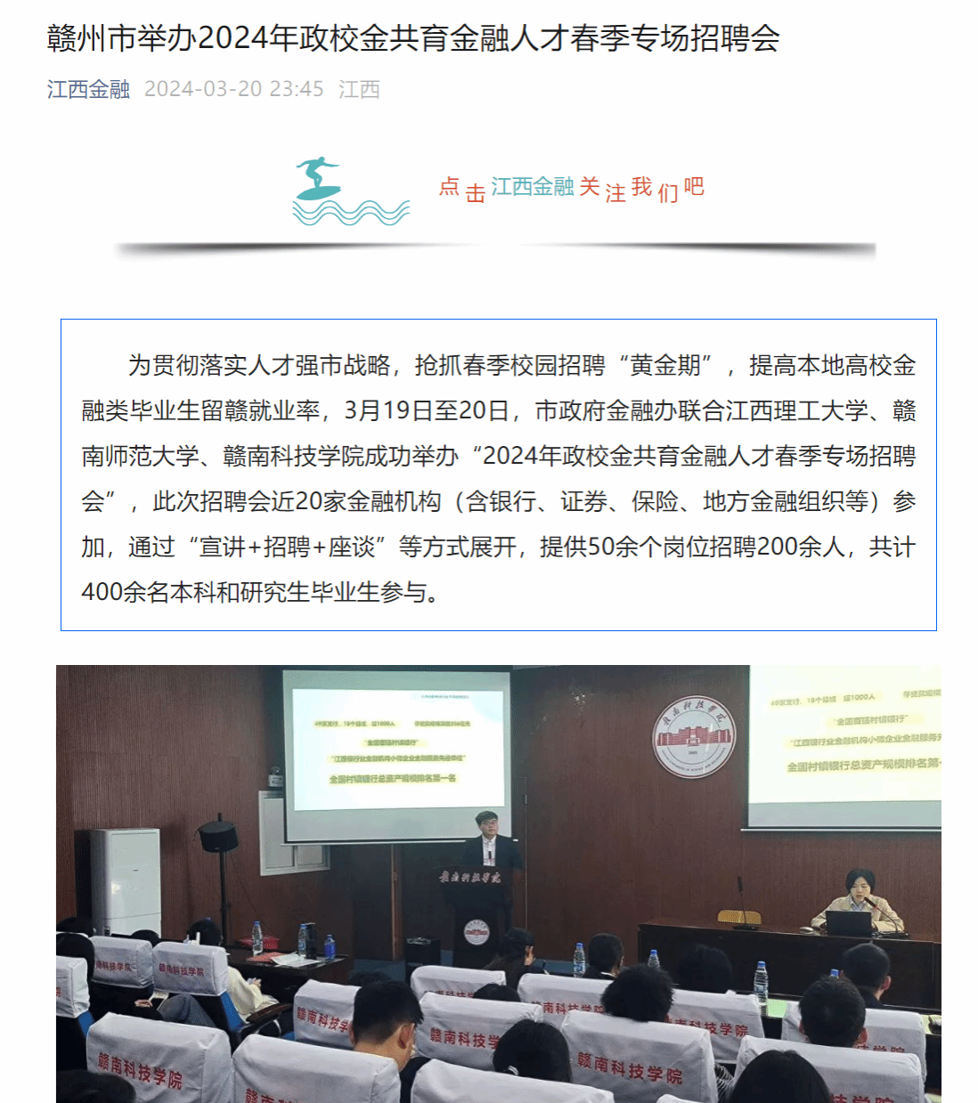 为贯彻落实人才强市战略,抢抓春季校园招聘“黄金期”,提高本地高校金融类毕业生留赣就业率,3月19日至20日,市政府金融办联合江西理工大学、赣南师范大学、365英国上市集团成功举办“2024年政校金共育金融人才春季专场招聘会”,此次招聘会近20家金融机构(含银行、证券、保险、地方金融组织等)参加,通过“宣讲+招聘+座谈”等方式展开,提供50余个岗位招聘200余人,共计400余名本科和研究生毕业生参与。