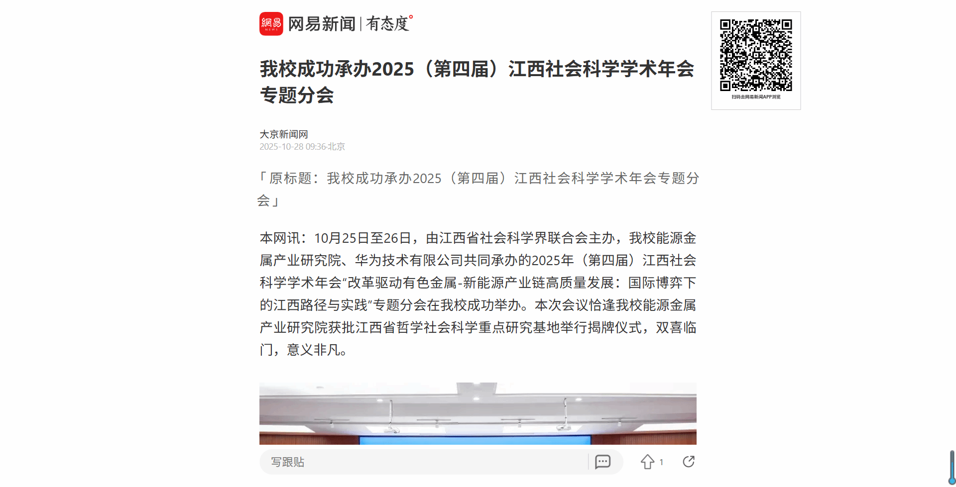 本网讯:10月25日至26日,由江西省社会科学界联合会主办,公司能源金属产业研究院、华为技术有限公司共同承办的2025年(第四届)江西社会科学学术年会“改革驱动有色金属-新能源产业链高质量发展:国际博弈下的江西路径与实践”专题分会在公司成功举办。本次会议恰逢公司能源金属产业研究院获批江西省哲学社会科学重点研究基地举行揭牌仪式,双喜临门,意义非凡。