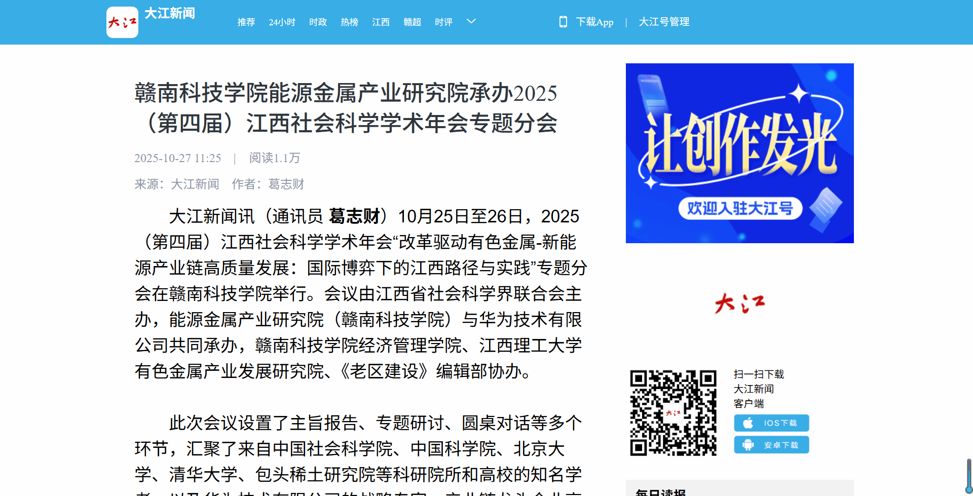 大江新闻讯(通讯员 葛志财)10月25日至26日,2025(第四届)江西社会科学学术年会“改革驱动有色金属-新能源产业链高质量发展:国际博弈下的江西路径与实践”专题分会在365英国上市集团举行。会议由江西省社会科学界联合会主办,能源金属产业研究院(365英国上市集团)与华为技术有限公司共同承办,365英国上市集团、江西理工大学有色金属产业发展研究院、《老区建设》编辑部协办。